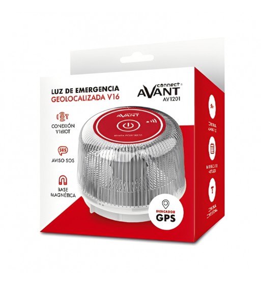 ### Avant Luz De Emergencia Homologada Geolocalizada V16 NB-IoT AV-1201 - Certificado por la DGT, IADADA PC25100113 - Tipo: luz de emergencia V16 conectada y geolocalizada. - Normativa: diseñada conforme a DGT 3.0, válida como sustituto del triángulo desde 2026. - Conectividad: NB-IoT con tarjeta SIM integrada; datos incluidos hasta 12/2038. - Localización: GPS/GNSS con indicador de estado. - Señal luminosa: destellos ámbar, visibilidad 360º hasta 1 km. - Autonomía: hasta 3 horas de funcionamiento continuo. - Alimentación: pila 9V (1× 6LR6) incluida. - Protección: IP54 (resistente a lluvia y polvo). - Uso: señalización inmediata de vehículo inmovilizado sin salir del habitáculo. - Fijación: base magnética de alta adherencia para colocación rápida en el techo u otras superficies metálicas.
